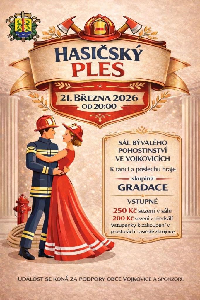 Předprodej vstupenek proběhne 17.2. a 24.2. v hasičské zbrojnici SDH Vojkovice od 18:00 do 20:00 hod. Přijďte si zajistit vstupenky včas - těšíme se na Vás!